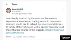 «Խորապես ցնցված եմ Երևանի կենտրոնում՝ բացօթյա առևտրի կենտրոնում տեղի ունեցած հզոր պայթյունի մասին լուրից: Ցանկանում եմ իմ անկեղծ ցավակցությունը հայտնել զոհվածի ընտանիքին և շուտափույթ ապաքինում մաղթել այս ողբերգության հետևանքով բոլոր վիրավորվածներին»,- Թվիթերում գրել է Քըլըչը՝ իր գրառումը հասցեագրելով հայկական կողմի բանագնաց Ռուբեն Ռուբինյանին և Հայաստանի արտգործնախարարությանը:
